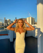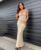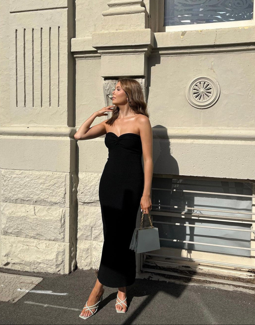 Meet your new summer go-to, the Nova Midi Dress is all about effortless polish. Featuring a strapless bandeau neckline with a twisted front detail, this fitted midi is crafted from breathable, stretchy cotton for all-day comfort. A back split adds ease and edge, making it perfect for both casual days and warm nights out.