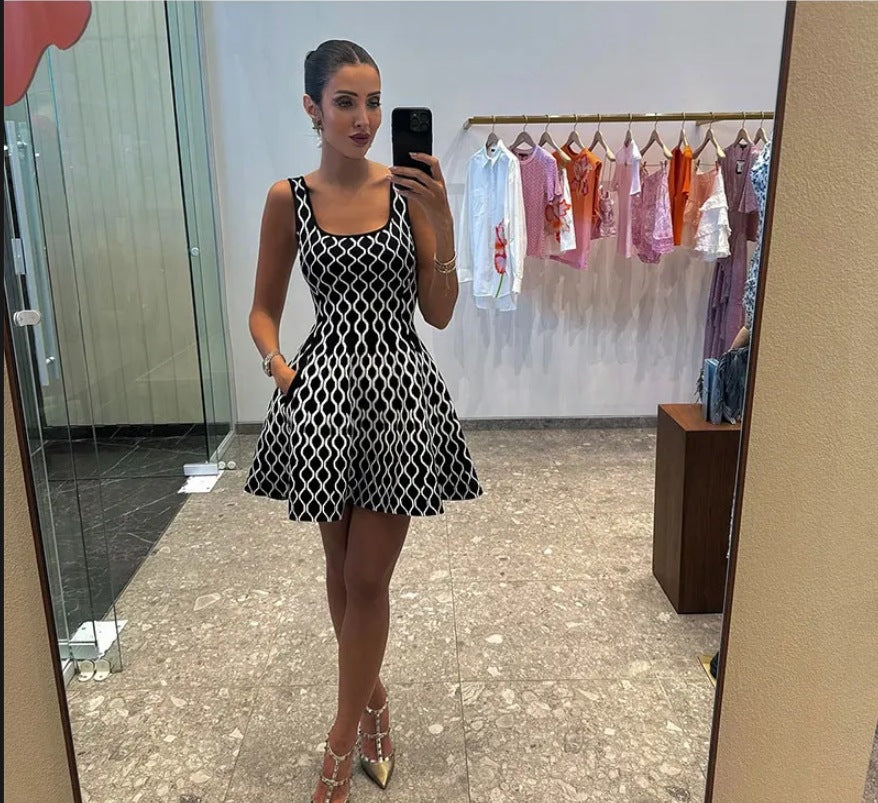 The Estrella Knit Mini Dress makes a bold statement with its striking black and white pattern and sleek, sleeveless design. The flattering contrast pattern accentuates your shape, while the knit material provides an easy, tailored fit that moves with you. Crafted from a fine blend of polyester and spandex, this mini-length dress is perfect for showcasing your favourite accessories or layering with outerwear.
