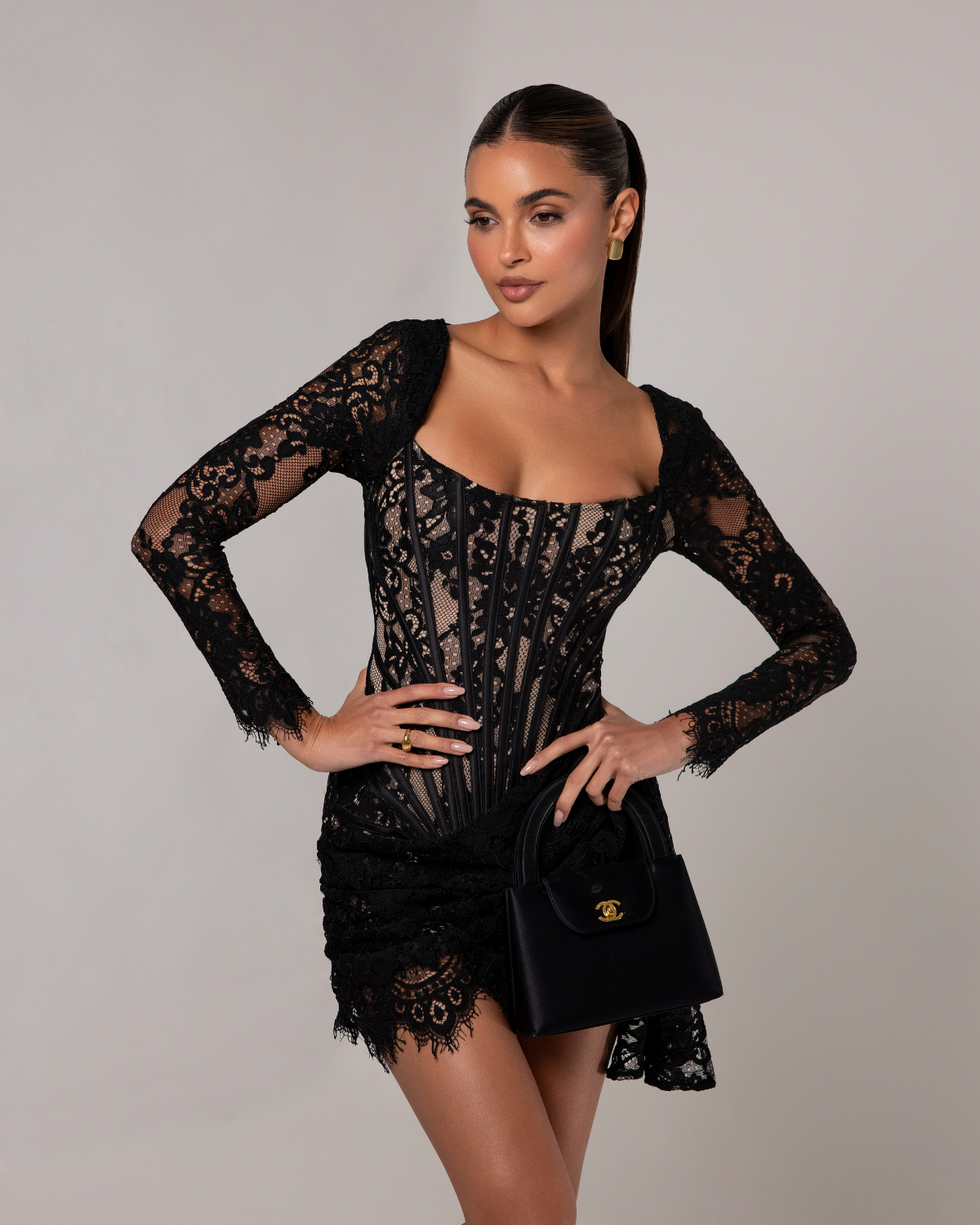 Chic and daring, the Chelsea Mini Dress is made to stand out. Featuring a sheer lace bodice that sculpts the figure, long sleeves for a touch of elegance, and a draped mini skirt to flatter the legs, this statement piece blends sophistication with allure—perfect for special occasions.