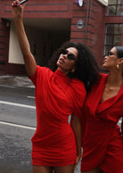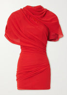 Command the room in the Katie Mini Dress, a bold silhouette that fuses modern glamour with vintage-inspired charm. Featuring structured shoulders, draped chiffon overlay, and a sleek bodycon fit, this mini is designed to flatter and impress. The cut-out back detail and silver-tone clasp closure add a striking finish, making it the ultimate showstopper for special occasions.